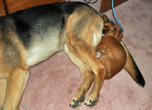 I am laughing so hard that the tears are running down my face. Poor Tilly just learned another life lesson the hard way. I’ve been in the den getting caught up on emails for the last hour or so. I looked around to see where Tilly was and I saw her curled up and sleeping with Tango. She had positioned herself between Tango’s tail and her hind legs and she had her muzzle parked in Tango’s butt. I mean she was literally nose to rectum. I quietly grabbed my camera and took this picture all the while thinking what a crazy place to sleep.