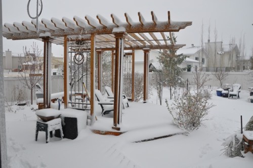 Our backyard is a winter wonderland again. There was so much snow drifted against the back door that I couldn’t open it from the inside. It is hard to believe that it was 26 degrees Celcius last week…….go figure????