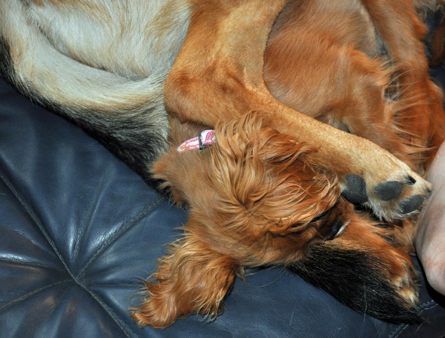 I don’t know what it is about Tango and Tilly but it seems like every time I find the two snuggling together they are in some weird position. First it was Tilly sleeping with her muzzle parked right up against Tango’s butt and now this. Tilly’s neck is sandwiched between Tango’s two back legs…..like she is in a wrestling death grip choke hold…..only she is peacefully asleep. Strange but true?!?