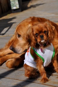 Tilly has been taking it easy since her spay on Tuesday. I didn’t have the heart to put the cone head on her but even if I did, it wouldn’t have helped. The good news is that she doesn’t lick much but the bad news is that she is really itchy from the belly shave. I had to come up with a plan “B” to stop her from ripping out the stitches while she was scratching wildly and to stop Wally from licking her belly. He is obsessed with it. If I don’t watch closely, she ends up soaking wet from his licking. I went to PetsMart and they were clearing out all the summer dog clothes so I was able to buy a long muscle shirt for $4. It completely covers her incision and protects from her scratching. I’m embarassed when she goes out in public with her shirt because it says “Don’t act like you are NOT impressed”.