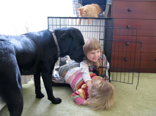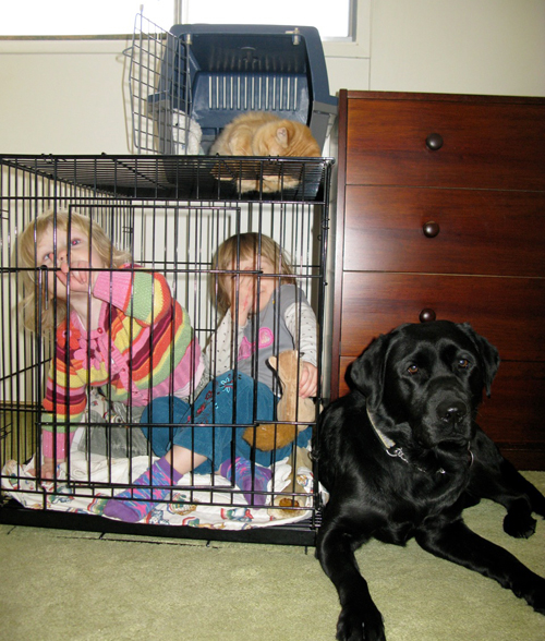 Susan has two active, energetic grand daughters and a 6 month old kitten.  Hope puts up with all the activity and excitement and shows no sign of stress or anxiety.  Susan shared these wonderful pictures of Hope, Copper (kitten), Petra and Gwen playing together and thoroughly enjoying each others company.  The girls just love crawling into Hope’s kennel and Copper likes to hang out on top.   It just brings tears of joy to see how Hope is living in the present and not letting her past affect her future.  We two-legged creatures could learn a lot from our four-legged friends.