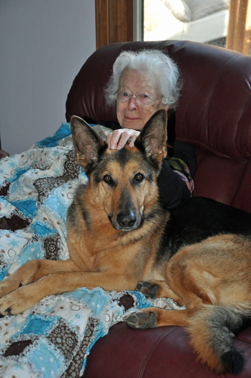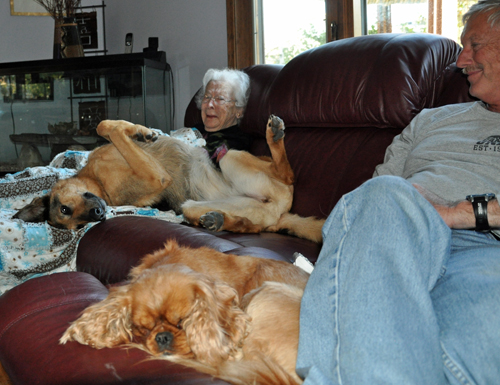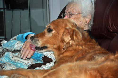 This week we had Don’s Mom over for dinner to celebrate her 96th birthday.  As you can see from the pictures, each dog took their opportunity to snuggle with Grandma and wish her a very Happy Birthday!