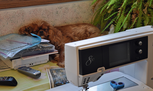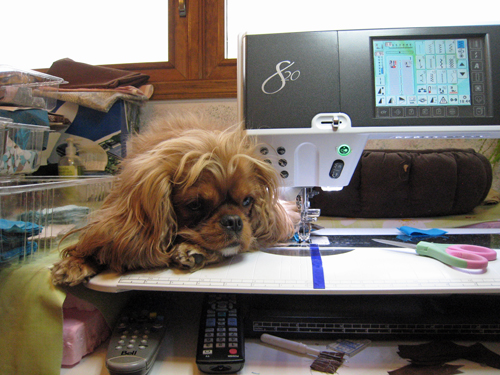 It is a wonder that I get anything done with Tilly hanging around. She always has to be in the middle of everything just in case I need her help. Sometimes she is so darn cute that I work around her rather that disturb her. Here are a few pictures of her helping me quilt and assisting me with my laptop.