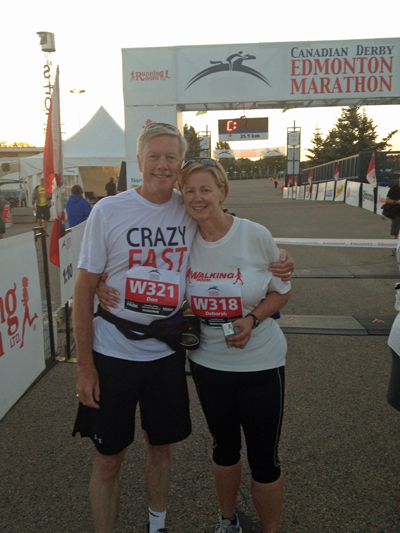 We did it. We completed the Canadian Derby Edmonton Marathon today. I can’t believe I actually did it. As we got closer and closer to today it became clear that it was going to be one tough race. Early in the week the forecast temperature was for the mid 20’s. Warm…considering that we aren’t scheduled to finish until 1:30pm. As of this morning the forecast was updated to a high of 31 degrees celcius…EGAD! That is crazy talk. We didn’t train for these temperatures and my body doesn’t like heat. We finished the first half in record time. I beat my previous half marathon time by 30 seconds. Our second half was a little slower but considering the temps, I am thrilled. Don won 1st place in his age category and I won first place in mine. I guess it pays to get old…..not many old folks like us compete in marathons so we win by default 😉