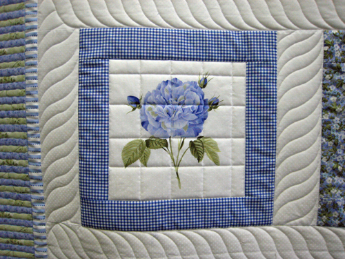 My second choice is my Blue Hydrangea quilt. This is the first quilt top I ever made. It hung around my sewing room for a year before I found a long armer to quilt it for me. Unfortunately he forgot to use the beautiful wool batting that I provided (he used a plain cotton blend) and he didn’t quilt the individual flower blocks they way we had discussed. It hung around for another year waiting for me to put the binding on. I procrastinated because I wanted to use a striped fabric on the bias but I had never made biased binding before. I’ve almost got all the binding on now but I still want to pick out all the stitching on the floral blocks and replace it with some free motion quilting that will show off the blocks. I’m a newbie free motion quilter (FMQ) so hopefully I don’t wreck the quilt.