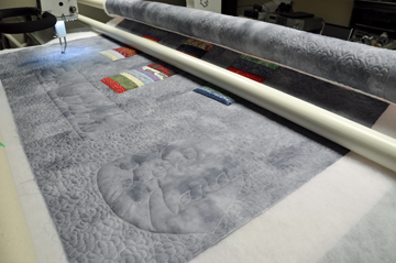 We used a polyester backing with lots of loft that allowed me to quilt designs into the background.  Susan has a dog and a cat that the girls just adore so I thought I should add their foot prints.