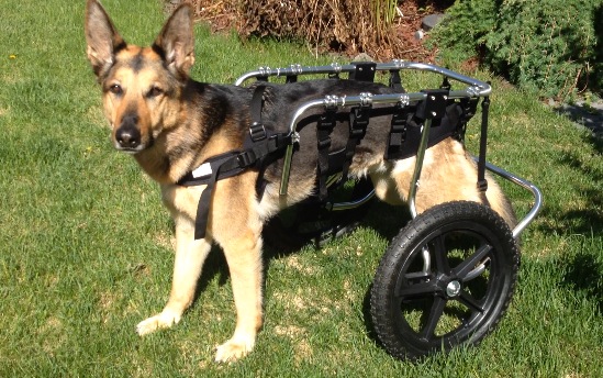 As Tango’s degenerative myelopathy progresses she is having a harder time trying to walk around.  She is constantly getting her back legs crossed or having them slip out from underneath her.  She can still bunny hop/run fairly well but changing direction and stopping are a real challenge.  We ordered a wheelchair for her and we have started getting her comfortable with it.  This is a video of her first time testing her new wheels.