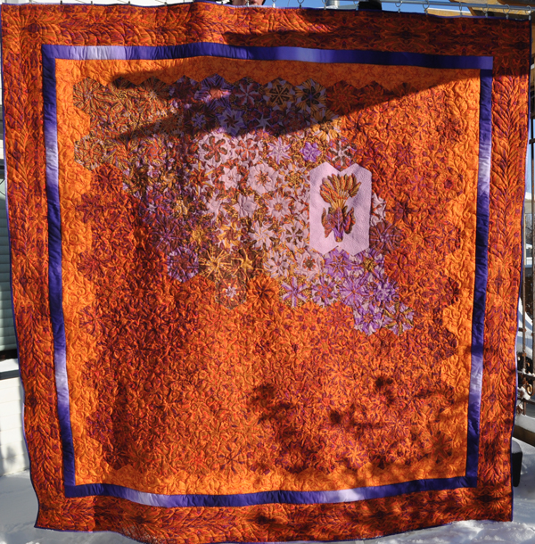 My third finish for the 4th quarter (original list is here)is a queen/king size one block wonder commission quilt for my massage therapist. She gave me a piece of fabric to use for my inspiration and then left everything else up to me.