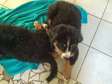 We made an unplanned visit to Johnson Farm today. We dropped off a blanket and a bunch of plush dog toys. The hope is that they will develop Mom Sophie’s scent and other comforting scents from around their home. These scented items should offer Spirit some comfort during her first fews days in our house. I managed to capture a few pictures of our visit on my phone. The adult Berner in the last photo is Journey. She let us know that she needed loving and attention as much as the little ones. Just two more sleeps!!!