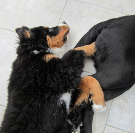 When I saw these pictures I couldn’t stop laughing.  It looks like Spirit was trying to give Hope a clear message.  In the first picture she is sound asleep with her nose parked in Hope’s behind and in the second one her eyes are wide open and see appears to be pushing her paw against the area that is offending her.