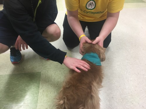 Tilly and I went to Fort Saskatchewan High School this afternoon. The kids are participating in a 24hr bike-a-thon to raise money for the Stollery Children’s Hospital. They took breaks to relax and chill out with the dogs.