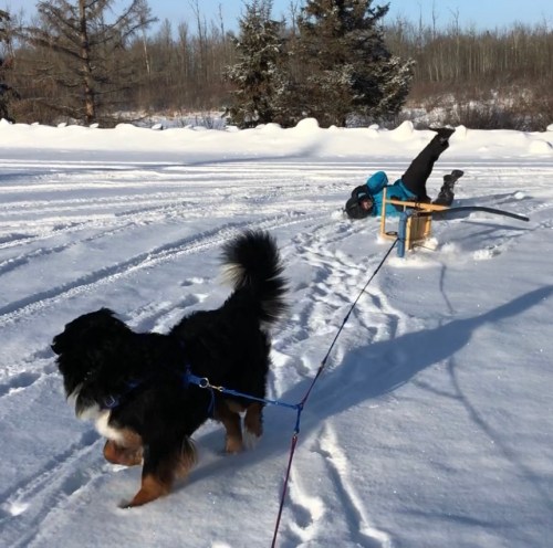 Kicksledding this winter has been fun but painful. I’ve had a few spectacular wipeouts. First run of the season…I made it through the entire run without wiping out. Got to the parking lot and the dogs took a sharp corner to get to Don and I ended up with one ski caught on a snow pile covering a curb and flipped on my right side. Don was so busy laughing and videoing that he forgot to catch the dogs and the sled as they ran by.