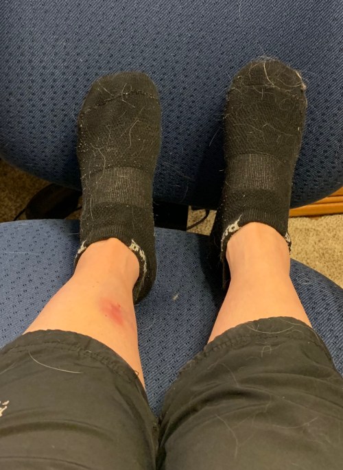 Today was my best wipeout ever. We were 1/2 way through the 4km run at Blackfoot. During a steep downhill run, Spirit stopped to gobble up a frozen ‘poop-sicle” on the trail. The sled caught up to her and was going to hit her so I bailed. Got the tow rope and one of the sled skis tangled around my ankle as the dogs took off running again. Big boo boo and fat ankle. Hope this wonβt end my Iron Paws season ππ (and yes that is dog hair all over my socks….canβt vacuum with a boo boo right?! π). I am hoping that at least I can get some sympathy points…maybe some spoiling and extra attention from the skinny guy. A girl can dream?!??!?