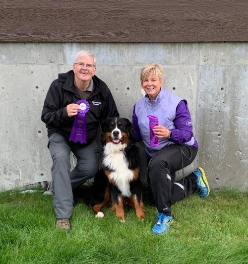 Sunday afternoon we had the games searches. Brodie was entered in Speed, Distance and Team and Spirit in Aerial. Brodie passed the Distance search to earn his Distance title but just missed the Speed component which would have given us a Games Championship. Our partner in the Team component false alerted early in our search so we were done for the day. The Aerial component was run last. I went on the walk through to see the search area and discovered that all the hides were hanging up against a wall and they were all at Spirit’s nose height. I spoke to the Judge and told him about Spirit’s surgery and how she really just wanted to get out and “play”. I said I would just let her walk slowly by the hides and not worry about passing or failing…just giving her a positive end to a crappy week. We were the first team. She strutted down the side of the building wagging her tail and walking with the classic Berner prance. It was so wonderful to watch her. To my surprise she went straight to the hide and did a brilliant indication. She was so proud of herself. It was her 3rd qualifier in Aerial so we walked away with a Title.