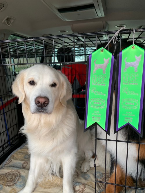 Brodie competed in Elite on Saturday in the biggest group of Elite competitors that I have ever seen. Unfortunately not only did no team title, not a single team passed even one of the three components. Sunday was a much better day. Several teams passed 2 of the 3 components but we were the only team that passed the first two components and had an opportunity to title if we got the third one. Brodie was doing really well. He found two hides in the exterior search where there can be 0 to 3 hides. We had less than 1 minute left in our search and he pawed at a picnic bench and I blurted out Alert so fast….sadly too fast because immediately I knew that it wasn’t a hide it was a distractor. Lately Brodie has started pawing at distractors (which is his alert at source) so I have been trying to wait to make my call to make so that I can be sure that the rest of his body language also leads me to believe that it is the hide and not a distractor. It was so disappointing being that close to a title and missing it. Ironically I think the Judge was even more disappointed that I was. He came up to me at the end of the trial to tell me what a wonderful partner Brodie is and how well he searches for a young dog. We ended up with a 2nd place in Interiors and a 3rd in containers.