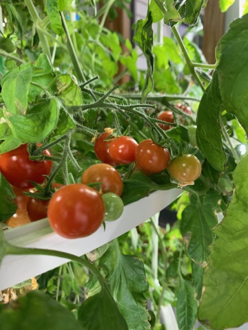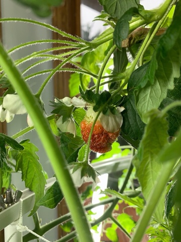 We are now overrun with beautiful ripe tomatoes and we have our first strawberry starting to turn red.