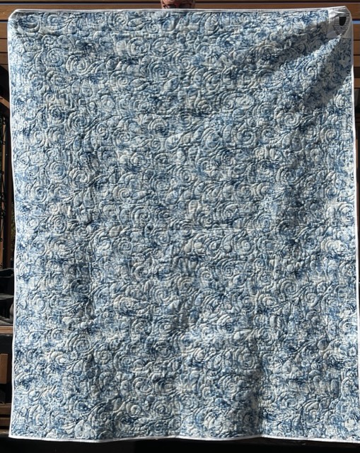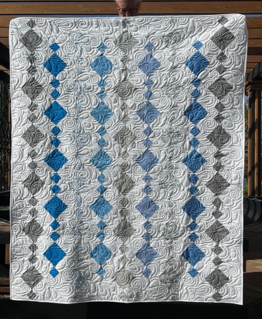 I still felt that we needed to thank her for her generosity so I asked her what her favourite colours were. Soft blue, black and white. I made this lap quilt to show her how grateful we are.