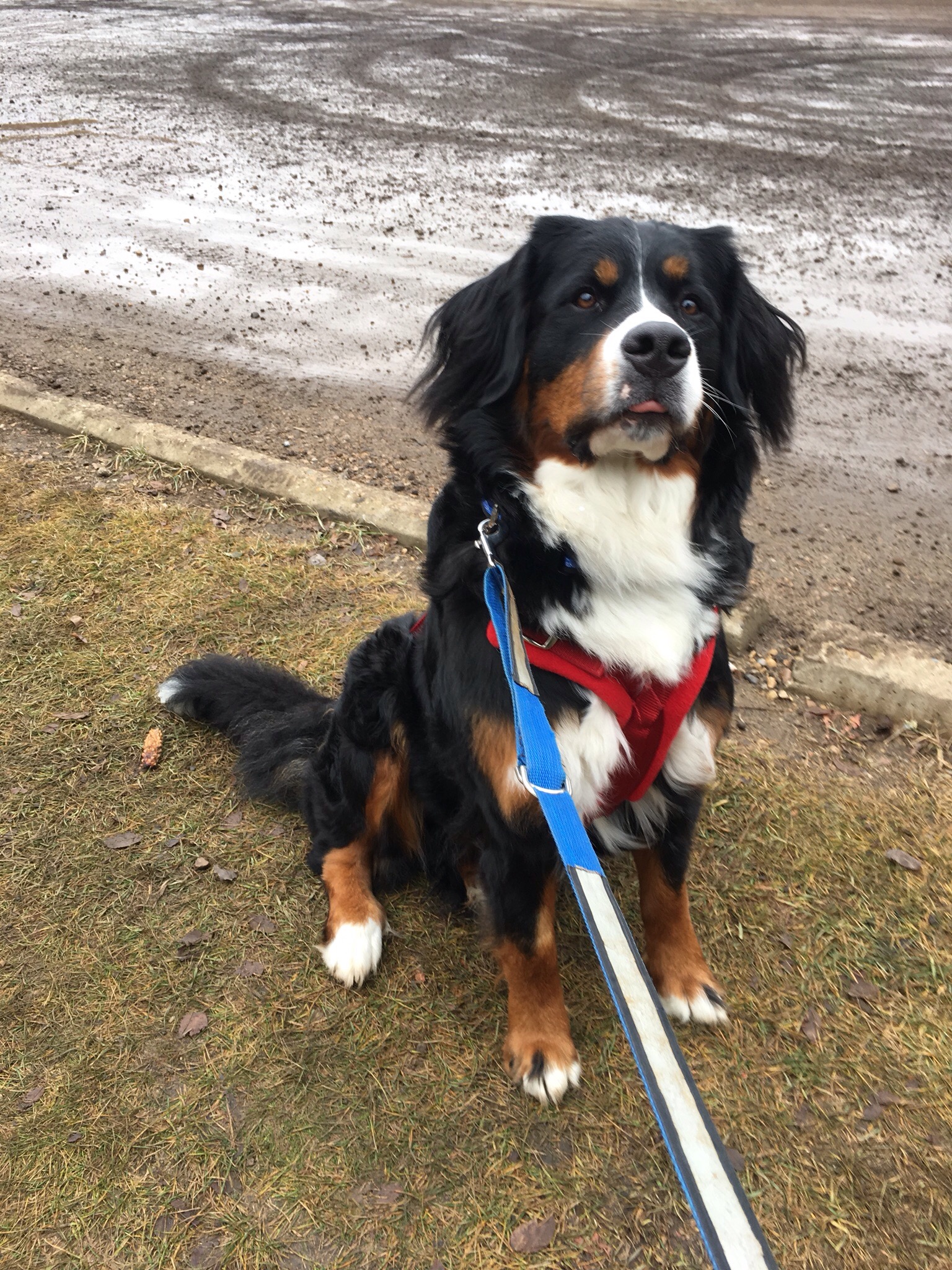 We drove to Calgary today to participate in a drafting/carting clinic put on by the Bernese Mountain Dog Club of Canada and the Newfoundland Dog Fanciers of Alberta. We were joined by Coreen & Steve Johnson of Tailspin Bernese (Spirit’s breeders) with their Newfie Ryder and two other Tailspin Berners, brother and sister Gunnar and Felice.