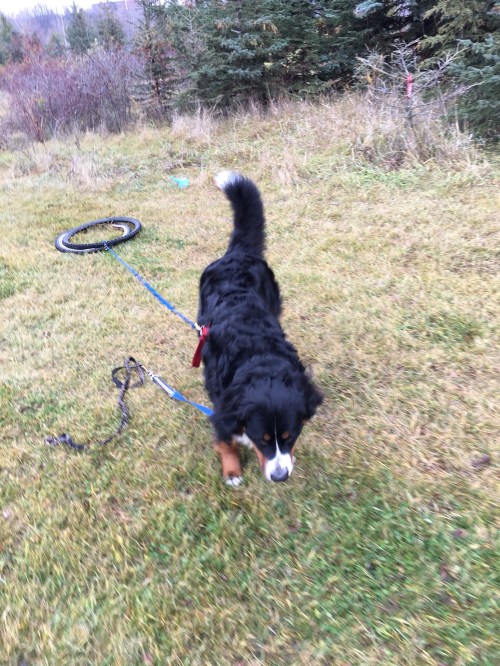 Today Spirit and I attended a pulling seminar. Berners were bred to pull milk carts so I thought it would be fun to try doing something that she would enjoy. It proved to be a bit of a challenge to start with. Spirit has been trained to walk beside me on a loose leash so I had a hard time getting her to go out in front of me and put some tension on the leash. The teacher said that dogs with good obedience always have more of a challenge with pulling sports. I did get her to drag a few old bike tires and at the end we did a little work with me on a scooter. If there was a dog in front of us she would pull a little. Hopefully I can get her to reliably pull in harness without losing her loose leash walk in a collar. Fingers crossed!!!!