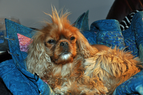 And of course there has to be a picture of little Tilly parked in the middle of my quilt as I hand sew the binding on. I love the bad-hair-day-mohawk-head. I looks like she was giving Don the evil eye because she was sick of the flash going off in her face repeatedly.