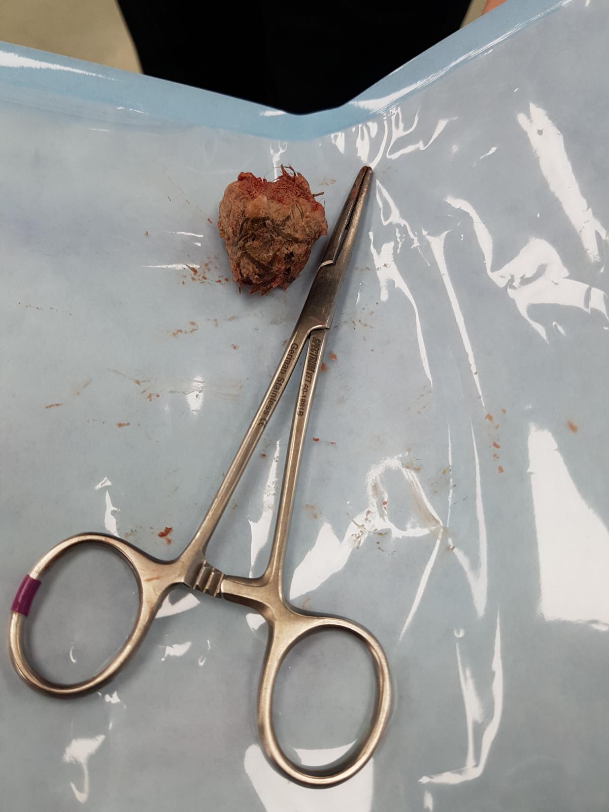 We have been on quite an emotional roller coaster this past week. All of a sudden Spirit could not put any weight on her right hind leg. There was no warning, no obvious accident or injury that could explain what happened. Our Vet checked her out and thought that the problem was with her spine. It was likely putting pressure on a nerve. We got pain meds and anti-inflammatory drugs and an appointment to see a Chiropractor. A couple of days later Spirit started throwing up repeatedly and refused to eat or drink. The only time this has ever happened was when she had an obstruction in her intestines almost 3 years ago. We took her to the Vet again and sure enough x-rays showed two masses. We started with barium and X-rays to see if there was any movement of the objects. The last X-ray of the day showed some movement so we decided to take her home for the night and come back in the morning for another X-ray. She had a rough night. It was very clear that she was dehydrated and getting weaker so they decided to do surgery ASAP. They had to make two incisions to remove each object which turned out to be chunks of bone 🦴. They sent me these pictures of her in recovery and one of the bone chunks.