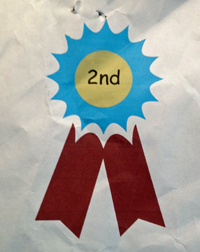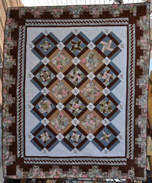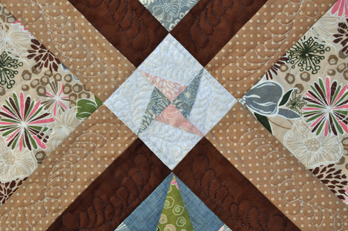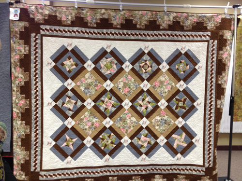 I worked on assembling the quilt top on and off in 2012 but I never really fell in love with it.  I tend to lean towards more modern quilt blocks with lots of negative space.  The good news is that because I wasn’t it love with it, it gave me so much freedom when it came to the quilting.  I wasn’t worried about wrecking something I loved so I just went for it.  I tried combining feathers and swirls and somewhat more intricate/complicated designs.  It took the 2013 FAL (finish-a-long) to light a fire and get me to finish the quilt in time for the annual BOM quilt show at QuiltEssential Co.  Much to my surprise I won second place.
