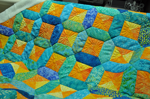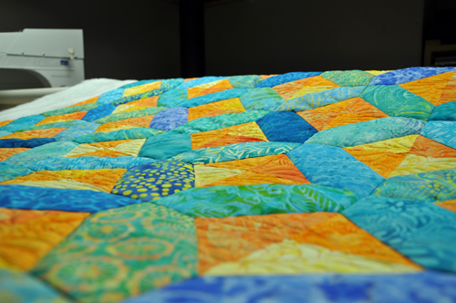 I decided to use a beautiful wool batting to give the quilt a nice loft. I chose to just quilt the orange/yellow centres and stitch in the ditch around the blue fabrics. It pushed the orange centres into the background and allowed the blue/green fabrics to really show off the loft of the wool. Unfortunately I forgot to take pictures of the finished quilt and backing. Hopefully Erin will take a few pictures and send them back to me.