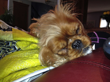 As usual, the minute I sit down to hand sew on the binding….my four legged helper just has to plunk her little, fat body right in the middle of my project. Then she starts flirting with me so my heart melts and I can’t kick her off.
