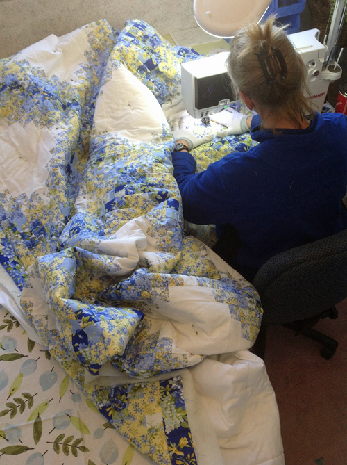 This quilt was a monster to free motion quilt because it was so large.  Here is a picture of me trying to work with all that bulk under a domestic sewing machine: