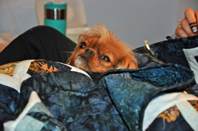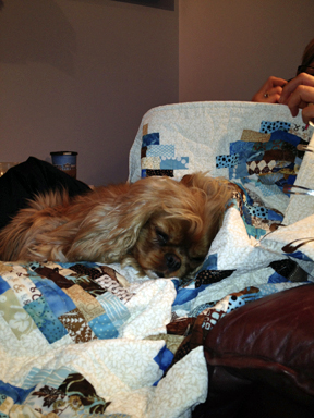 And of course there has to be a picture of little Tilly parked in the middle of my quilt as I hand sew the binding on. I love the bad-hair-day-mohawk-head. I looks like she was giving Don the evil eye because she was sick of the flash going off in her face repeatedly.