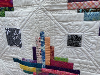 I volunteered to do the free motion quilting for members of my quilt guild who made a quilt top for Our Lady of Grace. Ioleen pieced this quilt from blocks that were donated by guild members. She gave me the freedom to quilt it however I wanted to. As usual, once I get going on the longarm I can’t stop myself. Hopefully she will like it.